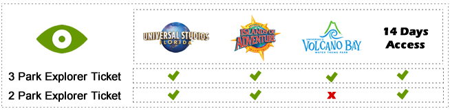 ‡The Universal Orlando 3 Park Explorer Ticket entitles one (1) guest admission to Universal Studios Florida, Universal’s Islands of Adventure, Universal’s Volcano Bay, and select live entertainment venues of Universal CityWalk (“CityWalk”) on all days during a fourteen (14) consecutive calendar day period which includes the first day any portion of the ticket is used. The ticket will expire in full on the expiration date printed on ticket. Unused days shall be forfeited.